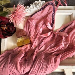Charming pink lace chemise with delicate bow detail. Soft and luxurious fabric. Ideal for a cozy night in. NWT please look over all the photos before purchasing or ask any questions all sales are final and as is.