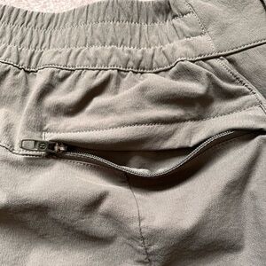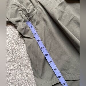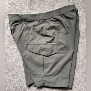Mens Lululemon 8” Utility Cargo Shorts size 38 waist in excellent like new condition. Perfect for any of your favourite outdoor activities with large cargo pockets as well as front pockets and a rear zipper pocket. Nice stretchy material and a stretchy waistband for all day comfort. Colour is a nice sage earth tone colour. These are made of a water resistant material.
