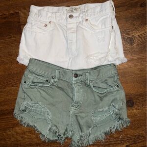 We the Free olive green cut off denim distressed shorts with button up front closure, front and back pockets and frayed hem