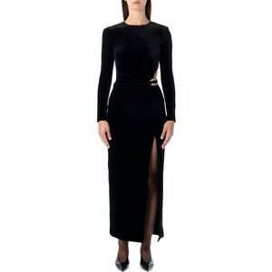 Experience the allure of this Black Velvet Maxi Dress from Self-Portrait, featuring a captivating side cut-out adorned with gold diamanté chains. The dramatic front slit, long sleeves, and fitted silhouette strike a perfect balance between sophistication and allure. Removable shoulder pads provide versatility, while the back zip fastening guarantees a seamless fit. Perfect for evening galas or red-carpet events.