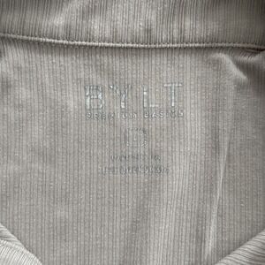 BYLT performance polo shirt men's large in beige stretch modal blend knit fabric with ribbed texture, short sleeves, and classic athletic polo construction. Made from breathable performance blend material designed for golf, training, and everyday wear.