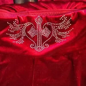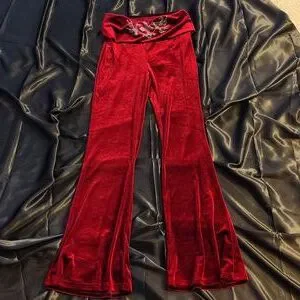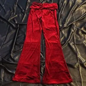Romwe dark red velour flare pants. Cute rhinestone design on back of fold over waistband. Pants look brighter red in photos than in person.