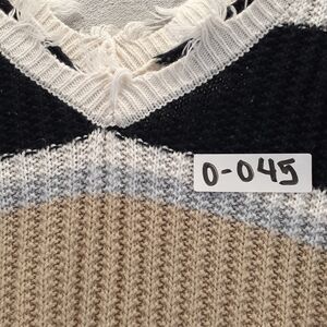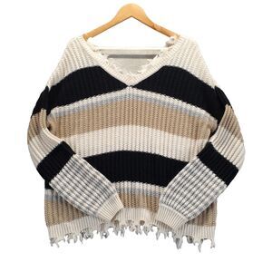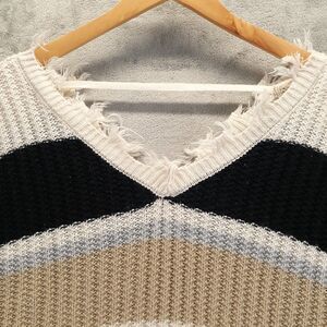 Rue 21 Sweater Women Sz M Black Brown Striped Distressed Hem V-Neck Oversized