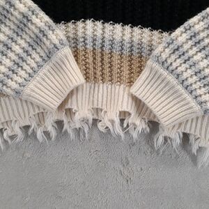 The product is a Rue 21 women's black and brown striped sweater in size M with a distressed hem, V-neckline, and oversized fit. Made from acrylic knit fabric with a chunky-knit style, this sweater features long sleeves and raglan sleeves, perfect for a casual occasion. The sweater also features a regular fit and is machine washable, making it a convenient and stylish addition to any wardrobe.