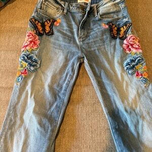 DRIFTWOOD Blue Flare Jeans with Floral Embroidery