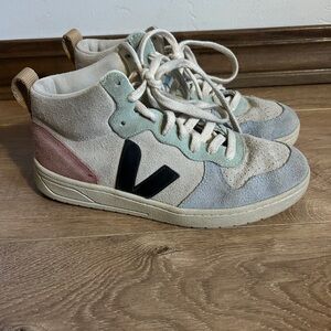 Add a quirky touch to your casual looks with the Veja V-15 sneakers. Beautifully crafted from suede with an Amazonian rubber, rice waste and recycled rubber sole, the shoes have been cut to a high top design. Featuring V logos to the sides, the sneakers are complete with pull on heel tabs to ensure ease as well as an effortless style.