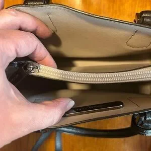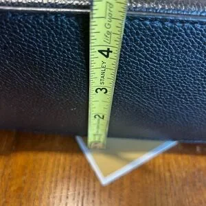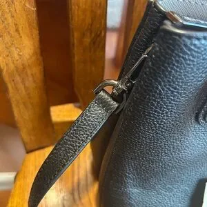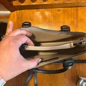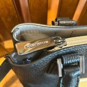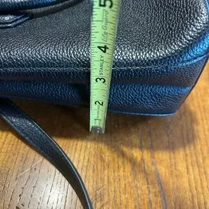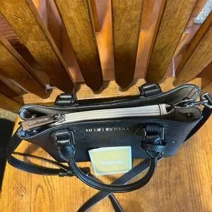 This sophisticated Michael Kors satchel in black features a structured design with a flat bottom, perfect for maintaining its shape. Crafted from textured leather, it includes both short top handles and a longer adjustable shoulder strap for versatile carrying options. The bag is accented with silver-toned hardware, adding a touch of elegance to its overall look. Please see pictures for measurements.
