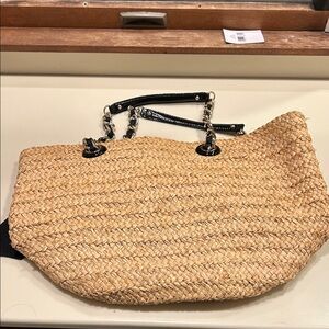 woven tote by Kate Spade. Beautiful black bow detail. Perfect for Spring and Summer! The bag is in good condition although there is some fraying (as shown in pics). In addition, there is a some yellowing of the fabric on the inside (see pic). The bag is a deep bucket when filled but because of how it’s been stored it does fold up on itself with nothing in it. The pictures with the bag standing are from me putting in filling. It won’t stand on its own.