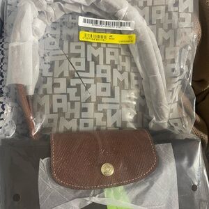 Stylish Longchamp tote featuring a sleek brown body and rich brown leather accents. Ideal for versatile use.