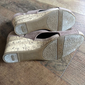 These are pre-owned Life Stride wedge sandals. They feature a light brown, perforated faux suede upper with an open-toe design. The wedge heel is constructed with a cork-like material. The sandals have a 'Soft System' insole for comfort. The soles show signs of wear, and there are minor scuffs on the upper material. The sandals appear to be in good, wearable condition.