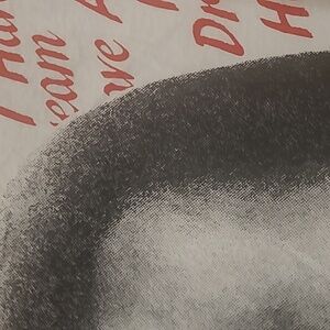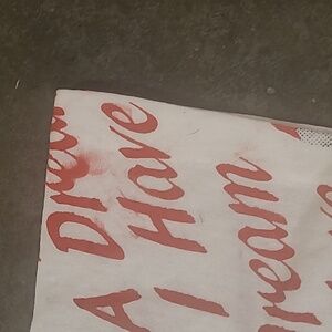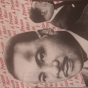 Vintage Martin Luther King Jr. "I Have A Dream" Tshirt by Kingstree. The tee features a large black/white image of MLK on the front and back surrounded by repeating lines from the famous "I Have A Dream" speech. Black, white, and red. Single stitch sleeves. Size Large. More measurements are listed below. 50% Polyester 50% Cotton. Made in the USA. The front and back of the tshirt has some smears in the ink of the text in a few different places (please view photos #5-8 and #11-15). In good vintage condition.