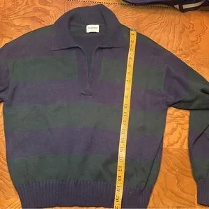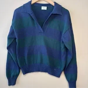 Sunday Best Fine Knit V-Neck Polo Sweater, Navy & Green Stripe, Preppy, Academia