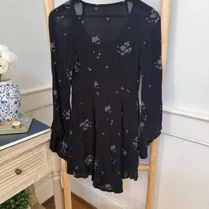 Free People Black Floral Embroidered V-Neck Bell Sleeve Mini Dress Size 0