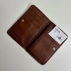 New with tag Brighton brown leather wallet. Trifold with multiple card holder slots and a photo or ID window. Large silver accent on the front. Small zip compartment on the back.