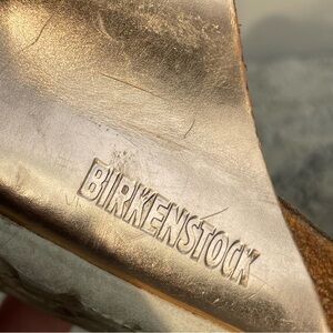 Elegant metallic gold sandals with Birkenstock branding. Ideal for everyday comfort.