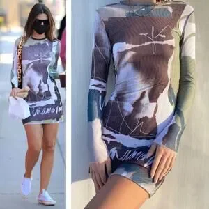 The long sleeve dress is doubled lined in mesh, making her semi sheer. Hits above the knee, with contrast stitching details. Stretchy.