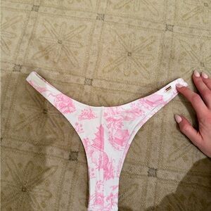 Chic swim bottoms with pink toile pattern. Perfect for a stylish beach day.