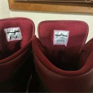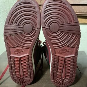 Dynamic Nike sneakers with maroon and black colorway. High-top design for support. Perfect for athletic activities.