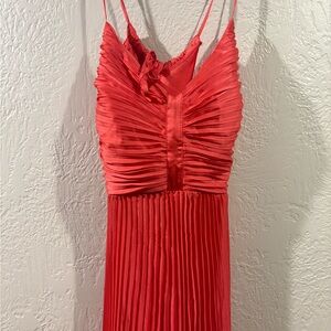 Stunning coral maxi dress with pleated design. Perfect for any event. Flattering and stylish.
