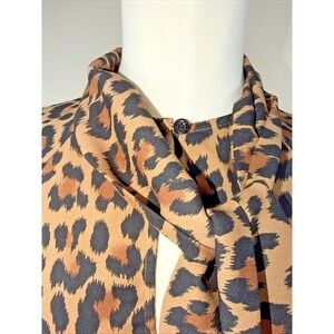 The product is a Kate Spade New York leopard print tie neck mini dress in women's size small. This Mini dress features a stylish Animal leopard print design, a tie scarf and button closure. Perfect for adding a touch of playful and bold style to any wardrobe, this dress is a statement piece that combines fashion-forward design with the signature quality of Kate Spade New York.