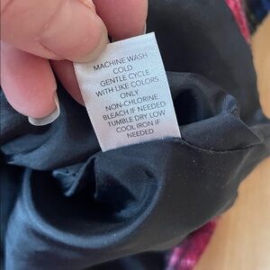 Chic plaid jacket with a bold red and black design. Ideal for everyday wear. Wool blend, great holiday layering piece. Great pre loved condition size petite small