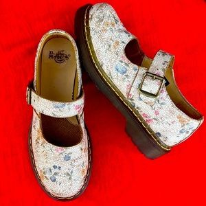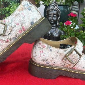 Dr. Martens Floral Crackle Mary Jane Loafers. Retro, vintage style with crackled finish that gives that aged, vintage look. Delicate floral pattern in shades of pink, blue, green, tan and white. Single strap / buckle. Round toe boxes.