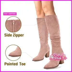Pointed Toe Knee High Boots Faux Suede Slouch Boots with Chunky Heel