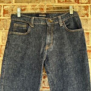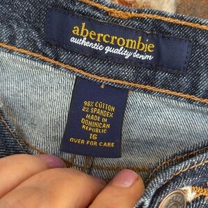 Stylish dark blue flare jeans. Features Abercrombie written in silver on back right pocket and silver stars by hem on left side. 2” Slits on outside hem of each leg.