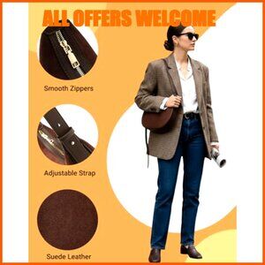 A slouchy, crescent-shaped handbag perfect for fall and winter styling. Features a versatile adjustable strap for crossbody or shoulder wear and a practical zip-top closure to keep your items secure.