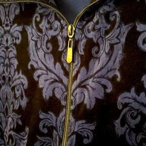 Elegant blue and black jacket. Features intricate pattern. Full zip front. Perfect for layering.