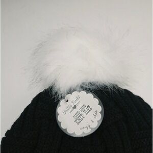 Braided Knit Beanie Hat with Faux Fur Pom Black