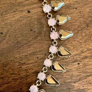 Pear Shaped, Faux Pyrite Stones with Light Pink Accents Stones in a Collar Length Necklace. Gold Tone Metal.