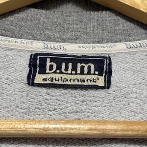 Description: Item is in distressed used condition with visible wear from age and use, giving it a vintage look. No major damage observed. Classic BUM Equipment crewneck sweatshirt made in Canada with spellout logo on front. Please check all photos carefully for exact cosmetic condition, fit, and details. Sold as is.