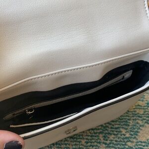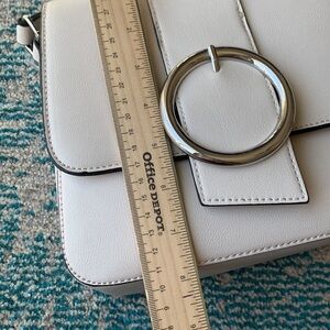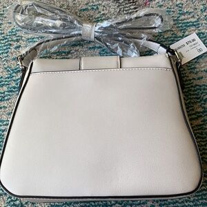 Best feature: an outside pocket for your phone! The alabaster color is creamy and smooth. See photos for size. This cross body bag will hold all your essentials without being bulky.