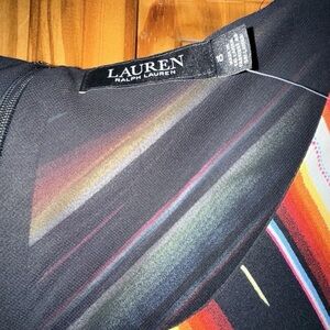 The NWT Lauren Ralph Lauren Southwestern Western Aztec Midi Dress, Size 10, is a stylish and comfortable casual dress perfect for everyday wear. Made from a polyester blend material, this dress features short sleeves, a midi length, and a swing style that is flattering and easy to move around in. The multicolor striped pattern adds a fun and vibrant touch, while the lining ensures a quality finish. With the trusted brand of Lauren Ralph Lauren, you can be confident in both the design and craftsmanship of this fashionable dress. Easy to care for with machine washable instructions, this dress is a versatile addition to any woman's wardrobe.