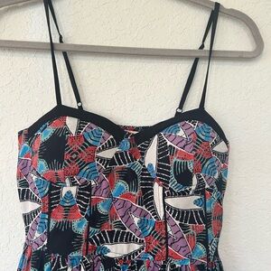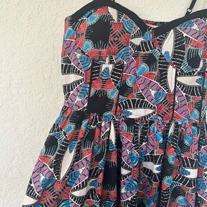Flirty Band of Gypsies mini dress with a bold abstract print in black, purple, teal, red, and white. Features adjustable spaghetti straps, a fitted bodice with subtle bust structure, and a flowy skirt for an easy, flattering fit. Lightweight and perfect for summer days, festivals, vacations, or casual nights out.