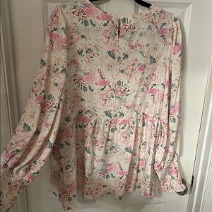 Chic floral blouse with long, smocked sleeves. Features pink and cream tones. Perfect for casual elegance. A beautiful top that can be dressed up or worn casual. A must have for Spring!