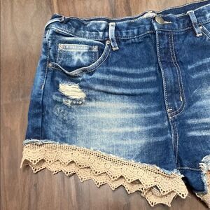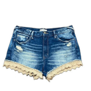 Free People Cream Lace and Blue Denim Distressed Jean Shorts