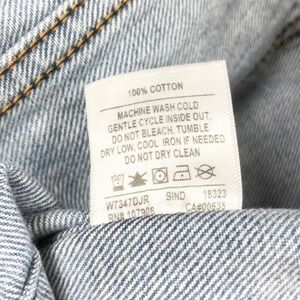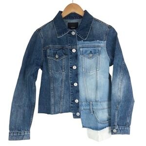 Keywords: NWT, Hudson denim jacket, patchwork denim, distressed denim, raw hem, reconstructed denim, blue denim, trucker jacket, statement jacket, designer denim, modern denim, unique jacket