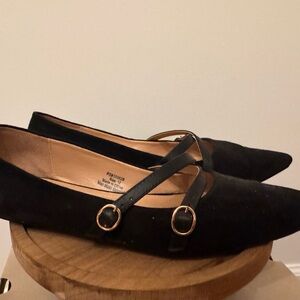 Chic black flats with stylish buckle straps. Perfect for versatile wear. Comfortable and elegant design.