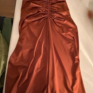Sophisticated bronze satin gown with subtle gathering. Perfect for special occasions.