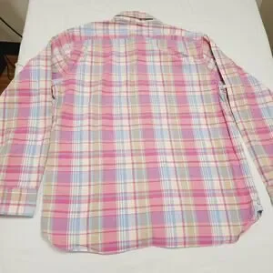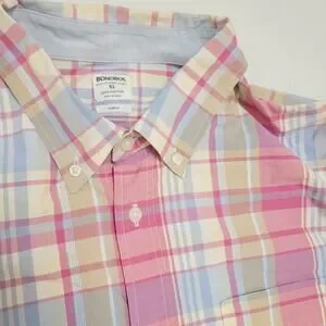The Bonobos Men's XL Pink Plaid Button-Up Shirt is a stylish and versatile option for various occasions, from casual to business. Made from lightweight cotton fabric with a woven texture, this shirt features a spread collar and long sleeves for a classic preppy look. The colorful pink plaid adds a pop of personality, while the regular fit ensures comfort and a flattering silhouette. Perfect for the spring and summer seasons, this shirt is easy to care for and suitable for everyday wear.
