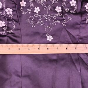 True Y2K prom / formal dress with white embroidery on black satin. Features a white peekaboo panel in the back of the skirt, a low back with lace up faux corset detail - this absolutely would have been an IT prom dress.