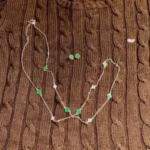 Charming Charlie necklace set with silver chain and green diamond clover accents. Stylish and versatile for any occasion.