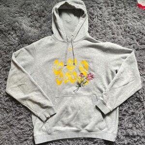 Comfortable gray hoodie. Features yellow graphic and pink floral design. Classic Nike style.