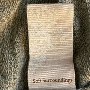 Soft Surroundings sage green l, very soft sweatpants/track pants have an elastic waist (the elastic is a looser type so not super stretchy), elastic at the hem and deep pockets at the thigh areas on both sides. The material is really soft and has plenty stretch.