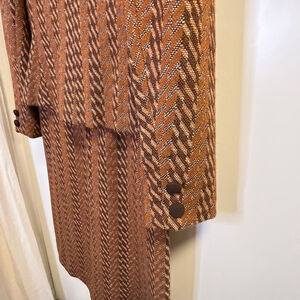 The jacket has dark brown trim, fabric-covered buttons (extra still attached to lining), and a structured silhouette, paired with a matching pencil skirt. Fully lined.