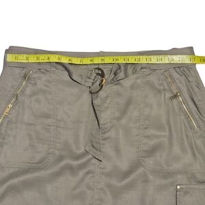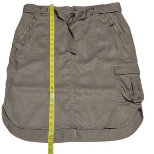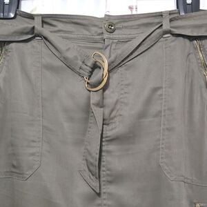 Stylish olive green skirt with a belt and zipper pockets. Perfect for casual outings.