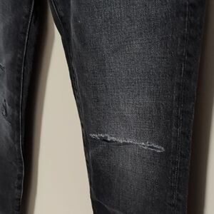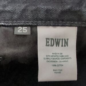 Sleek black slim jeans by Edwin. Features subtle distressing. Ideal for casual wear.