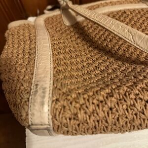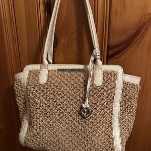 Chic Brighton tote with woven texture. Features tan and cream colors. Elegant heart charm accent.( Minor Stain )